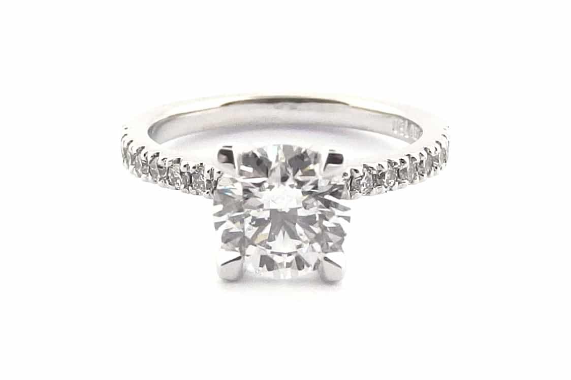 One natural round brilliant cut diamond weighing 1.25ct (D colour SI1 clarity) four claw set in handmade 18ct white gold ring with matching 0.015ct brilliant cut diamonds claw set half way around the band.