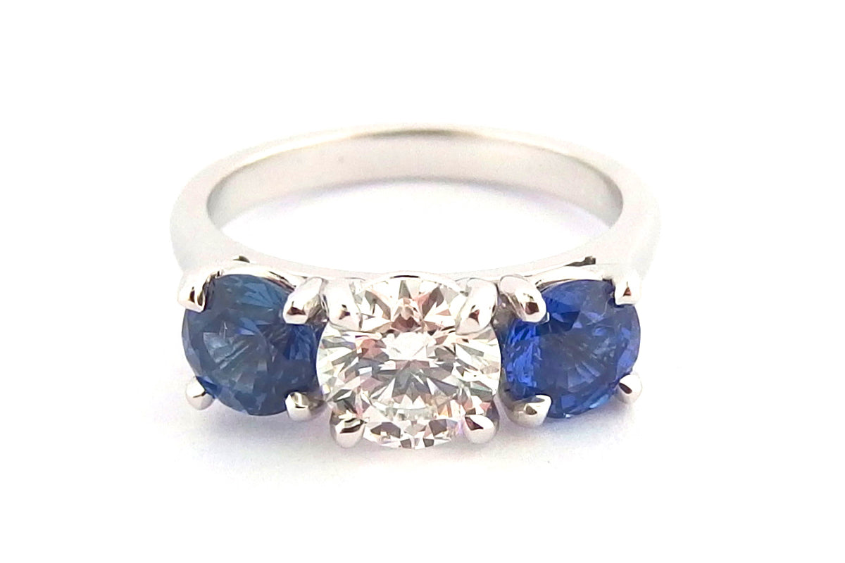 One natural brilliant cut diamond weighing 0.88ct (D colour SI1 clarity) with two brilliant cut ceylon sapphires weighing 1.39ct total (measuring 5.0mm) handmade ring.   *Please note that the gemstones and diamonds used in this ring can be adapted to suit most budgets and specifications. Please contact us for further information*