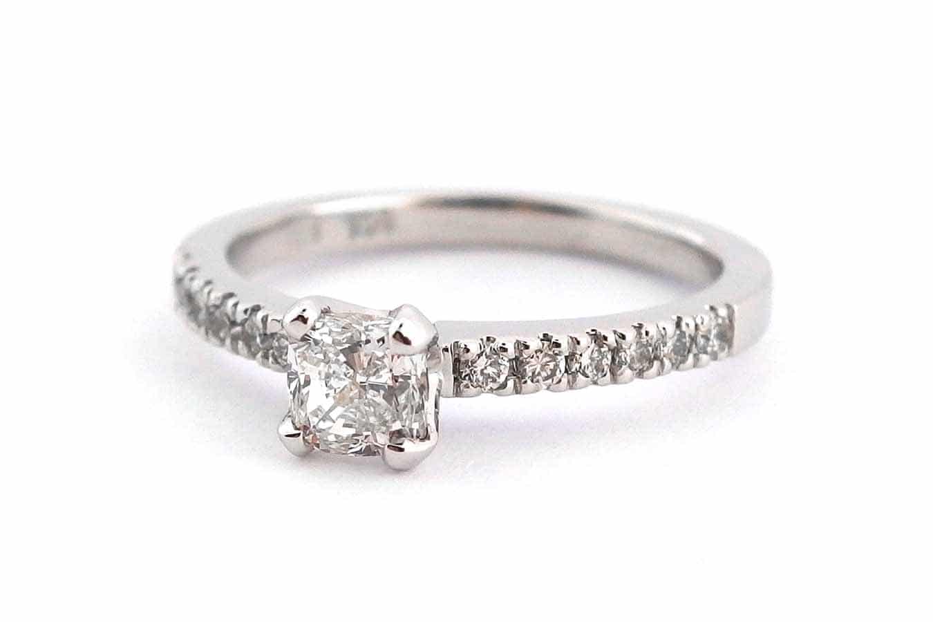 One natural cushion cut diamond weighing 0.50 (F VS1) set in a handmade 18ct white gold ring with 12 x 0.015ct matching diamonds along the band.   *Please note that the gemstones and diamonds used in this ring can be adapted to suit most budgets and specifications. Please contact us for further information*