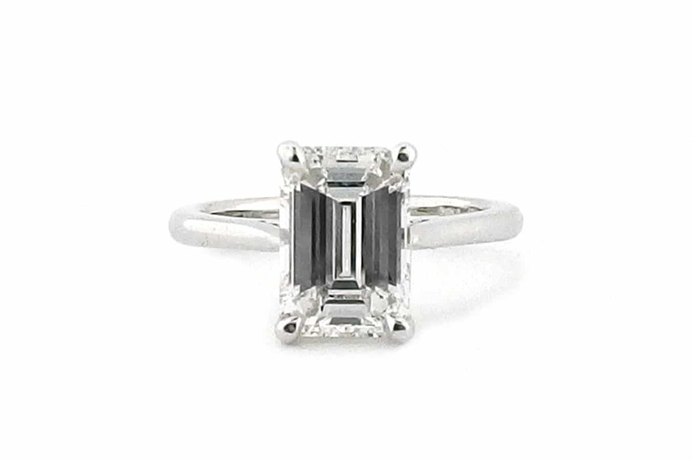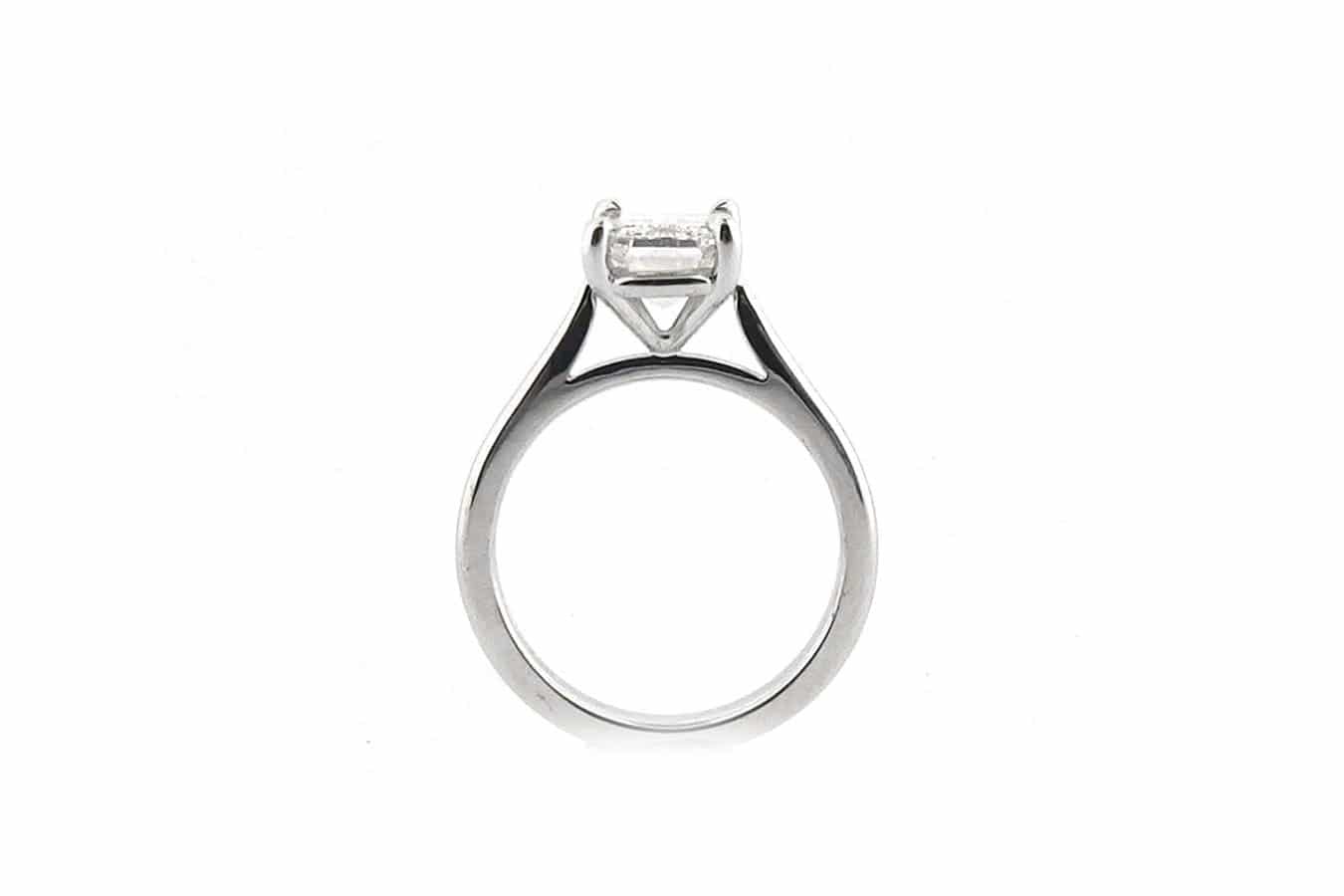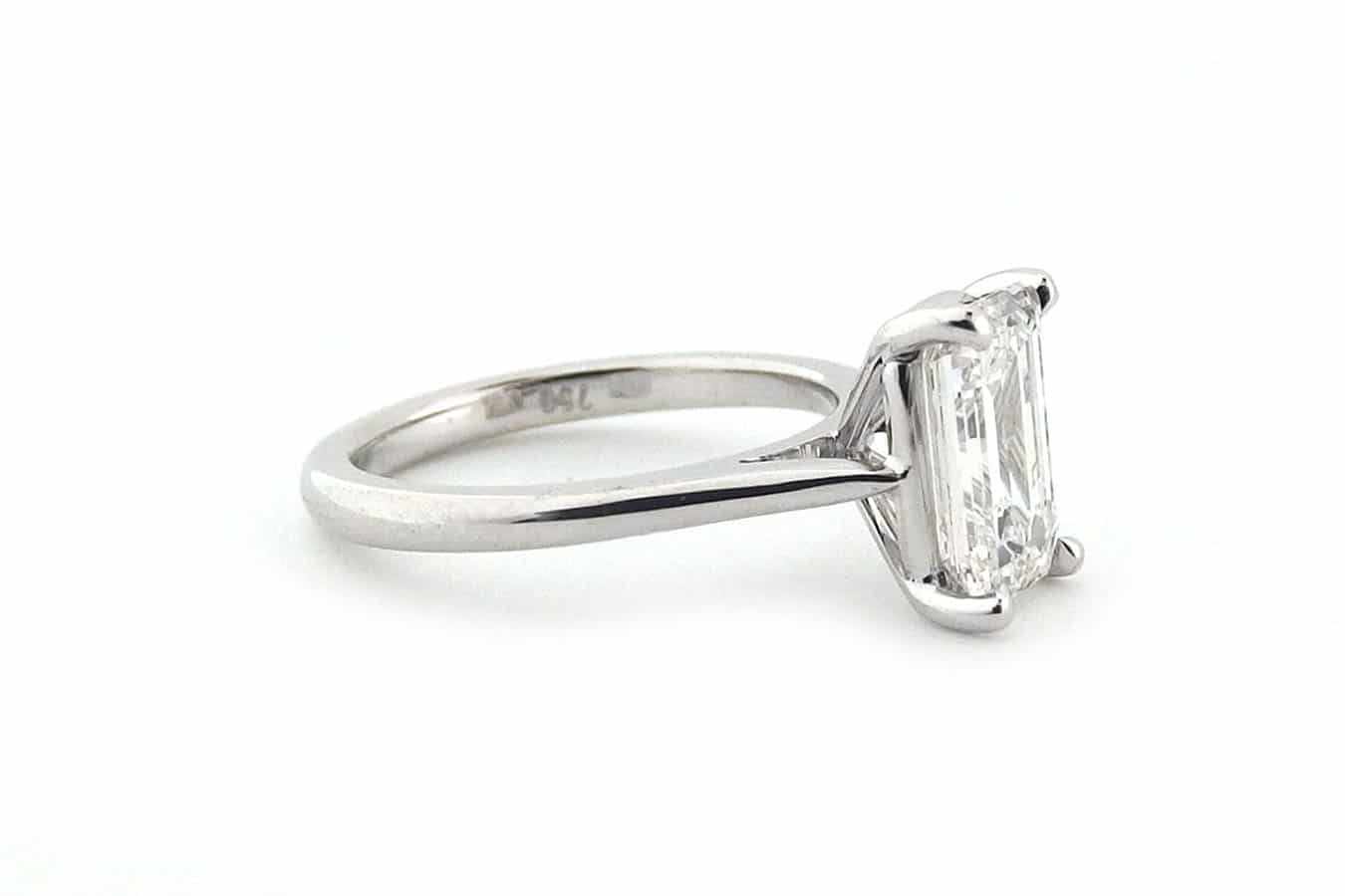 One natural emerald cut diamond set into a four claw 18ct white gold ring.