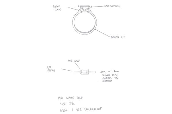 One natural emerald cut diamond weighing 0.80ct (F colour VS2 clarity) four claw set in a handmade 18ct white gold ring.   *Please note that the gemstones and diamonds used in this ring can be adapted to suit most budgets and specifications. Please contact us for further information*