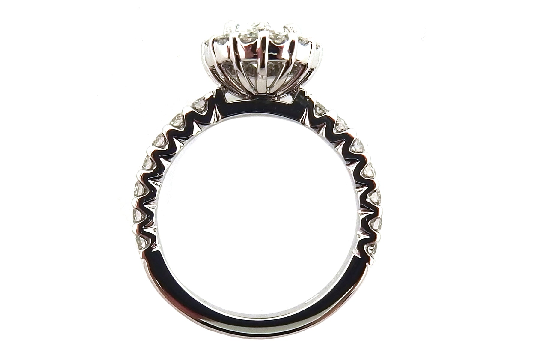 One 18ct white gold oval diamond cluster ring with round brilliant cut diamonds set in the band.