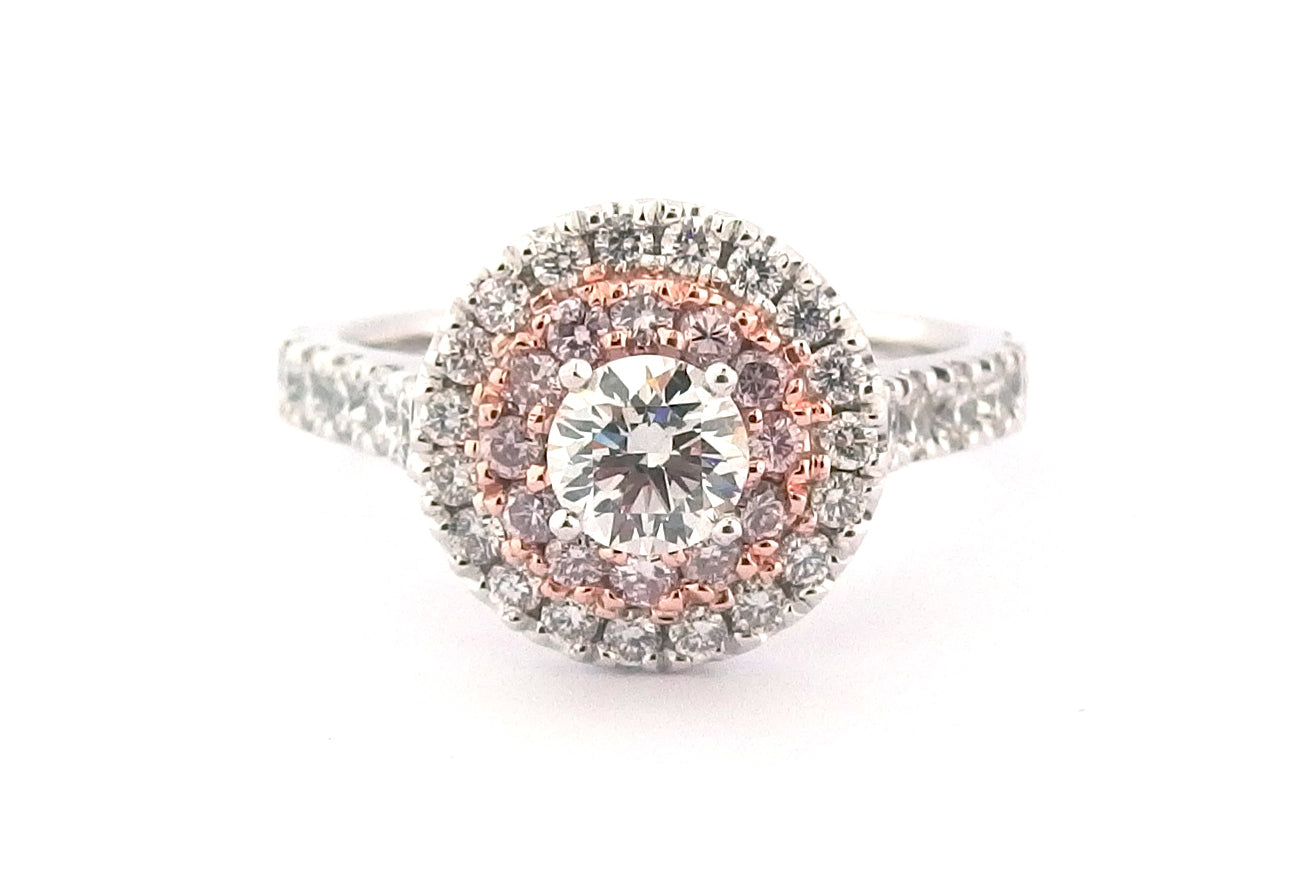 One natural brilliant cut diamond weighing 0.50ct (G SI1) set in a handmade platinum ring with a halo of 0.015ct brilliant cut pink diamonds (7P colour SI clarity) and a halo of 0.015ct white diamonds with 12 x 0.065ct set into the band (G colour SI clarity).
