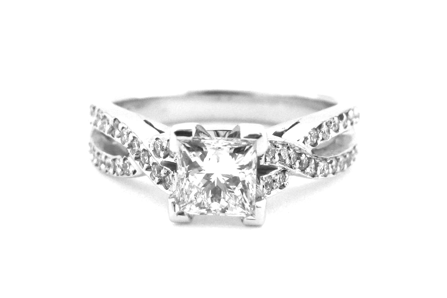 One natural princess cut diamond weighing 0.71ct (G VS1) corner set in hand made 18ct white gold ring with 0.005ct brilliant cut diamonds bead set in crossover band.   Please note that the gemstones and diamonds used in this ring can be adapted to suit most budgets and specifications. Please contact us for further information.