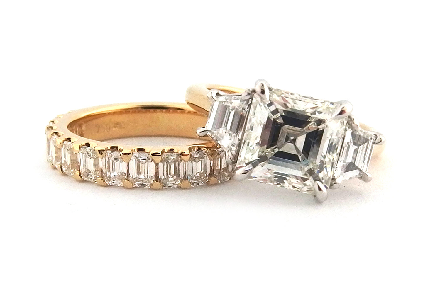 One handmade 18ct yellow gold emerald cut diamond wedding ring.