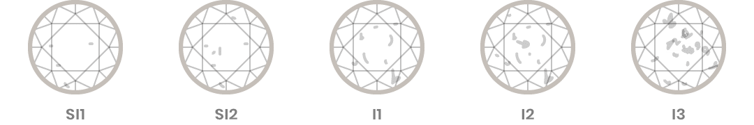 SI1, SI2 / Slightly Included: The diamond contains inclusions (clouds, included crystals, knots, cavities, and feathers) that are noticeable to an experienced grader under 10x magnification.