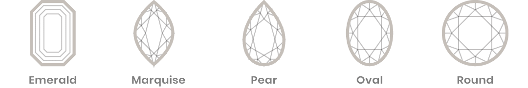 Diamonds come in a wide range of shapes. Round Brilliant Cut diamonds are the traditional cut and are always popular but Princess (square) Cuts, Cushion Cuts, Pear, Oval, Marquise, Trilliants, Radiants and several others are also multifaceted diamonds. Emerald Cuts, Baguettes and Asscher Cuts are “step cut” diamonds and look quite different but very beautiful in their clarity. We recommend a clarity grade of VS1 for step cut stones.